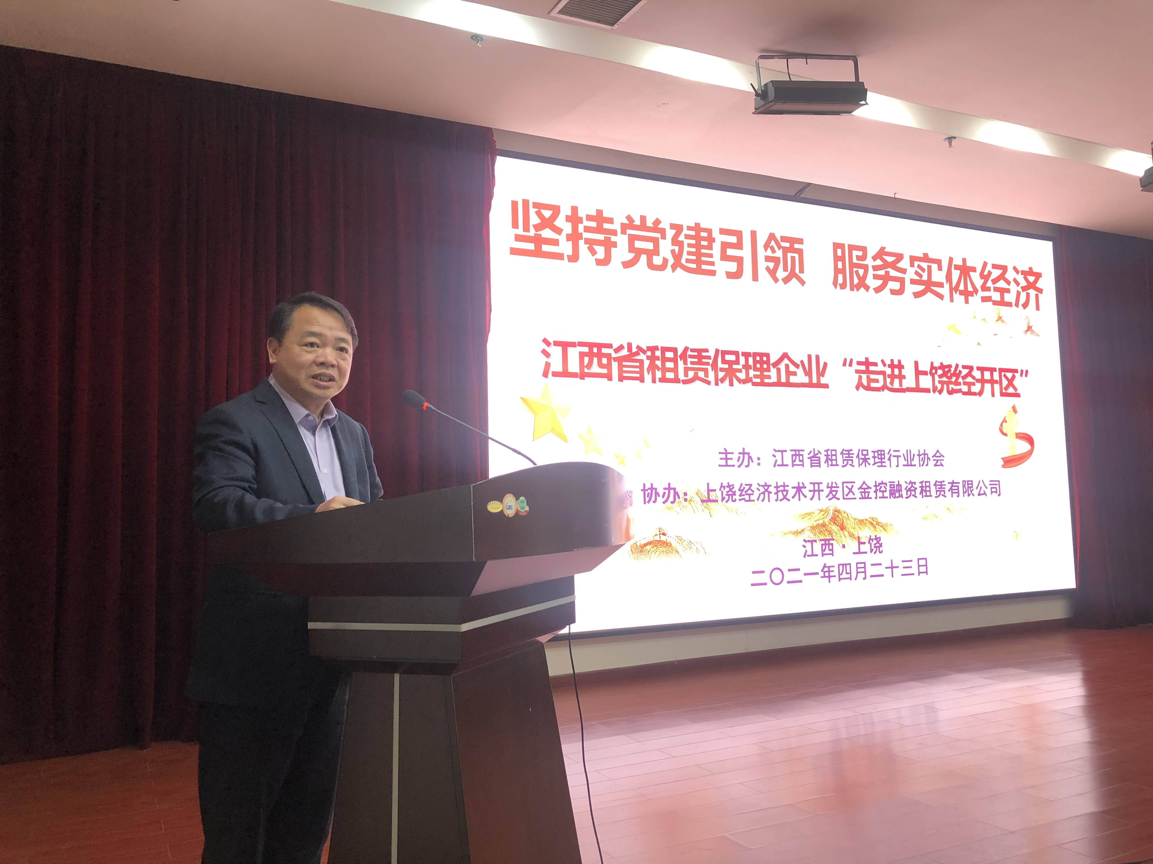 ????? 2021年4月23日,江西省租賃保理行業(yè)協(xié)會以“堅持黨建引領(lǐng),服務(wù)實體經(jīng)濟”為主題,在上饒經(jīng)開區(qū)成功舉行會員企業(yè)“走進上饒經(jīng)開區(qū)”活動。江西省地方金融監(jiān)督管理局、上饒經(jīng)開區(qū)管委會、上饒市政府金融辦等政府有關(guān)部門領(lǐng)導(dǎo)及協(xié)會單位、上饒市及經(jīng)開區(qū)重點企業(yè)等100多名各界嘉賓出席,江西省租賃保理行業(yè)協(xié)會會長、江西省海濟融資租賃股份有限公司董事長柳習(xí)聰主持活動。