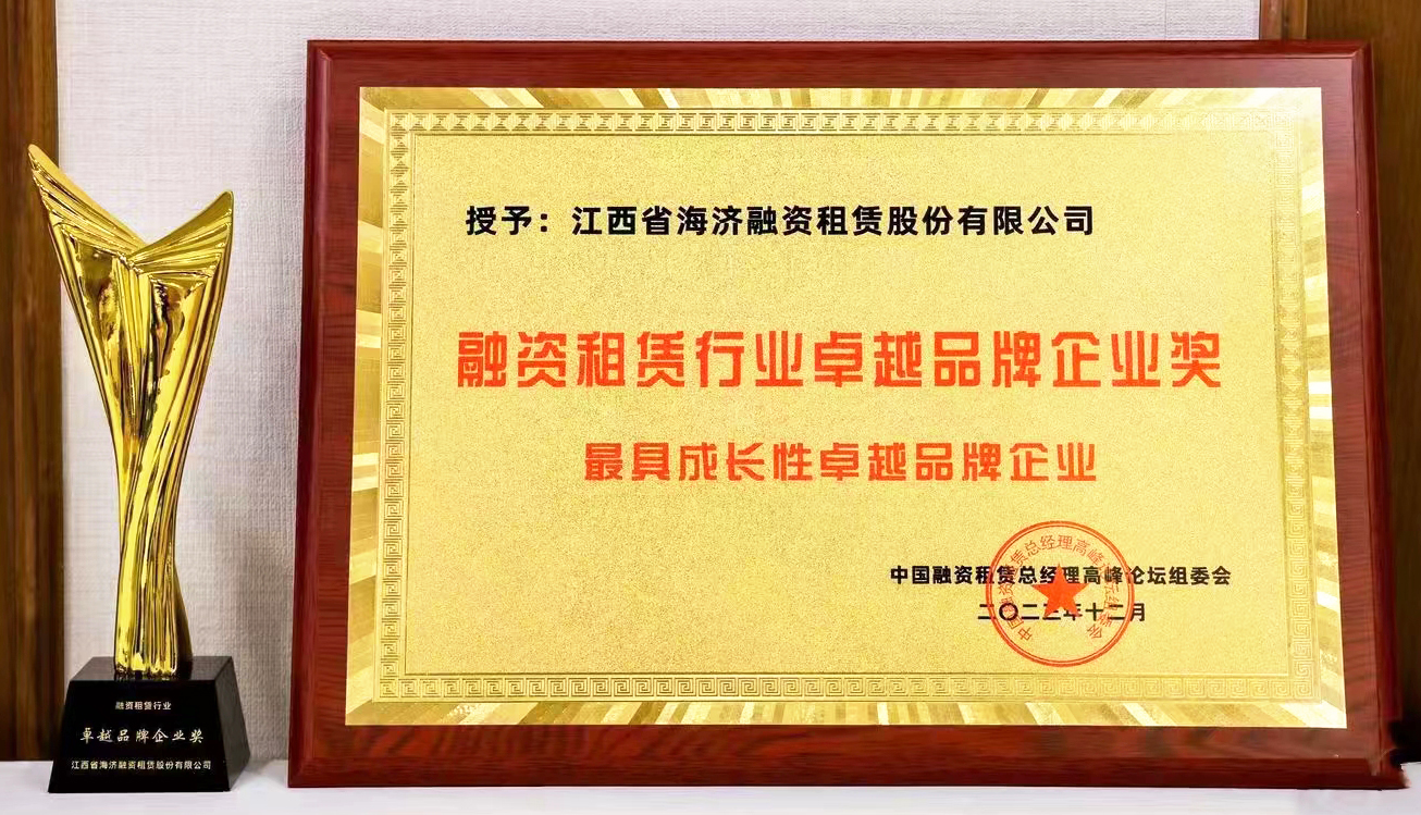 ? ? ? 12月21日,“2023中國融資租賃總經(jīng)理論壇金鼎獎頒獎盛典”在北京順利召開,江西省海濟融資租賃股份有限公司憑借優(yōu)秀的品牌建設、專業(yè)的品牌管理和極具成長的品牌價值,榮獲融資租賃行業(yè)卓越品牌企業(yè)獎。